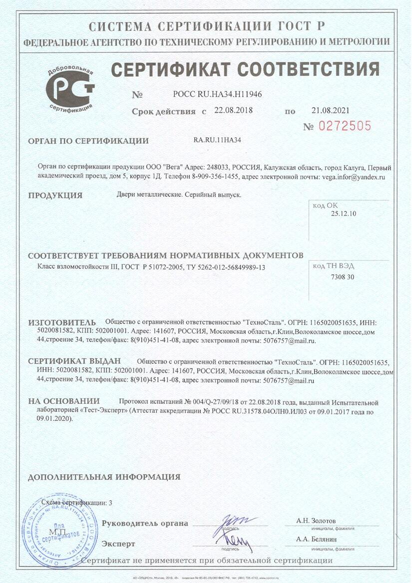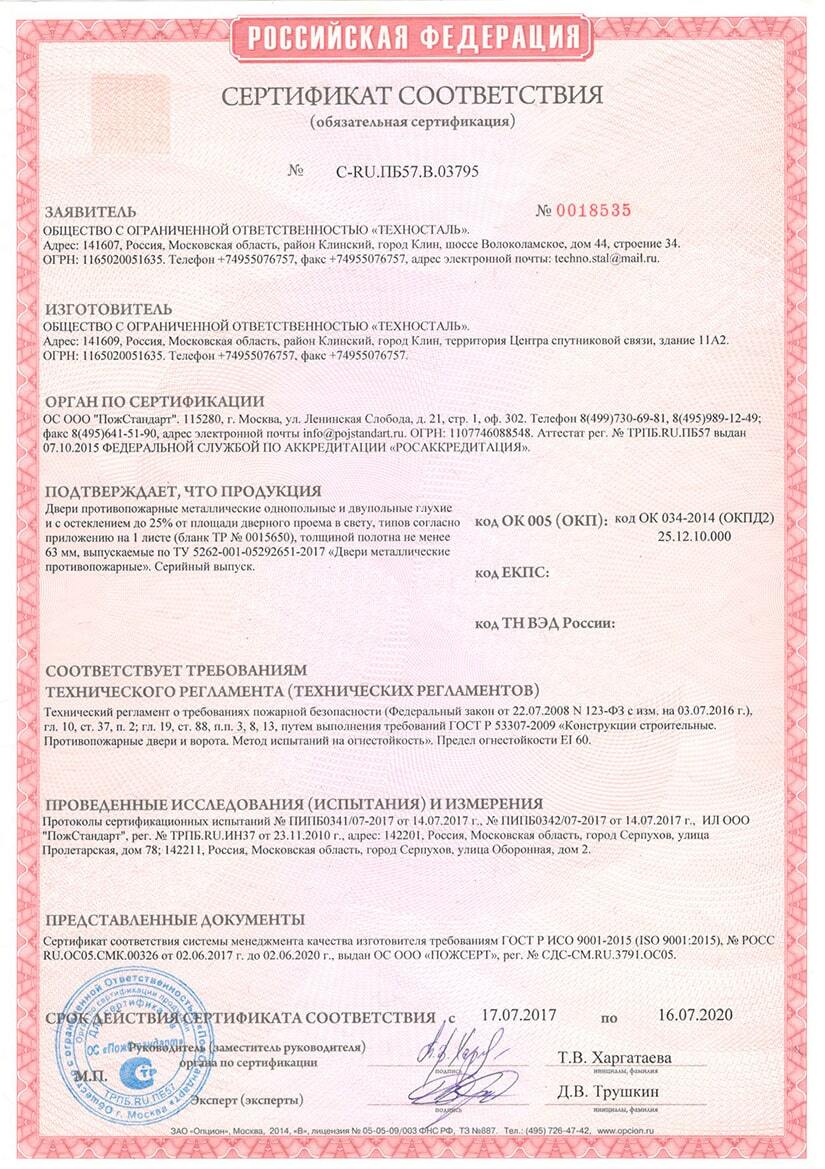 ГОСТом53307-2009 установлено, что дверь должна проходить испытания на огнестойкость. Все наши двери имеют максимальный предел огнестойкости EI 60. Это означает, что дверной блок способен сопротивляться огню без потери целостности в течение 60 минут.