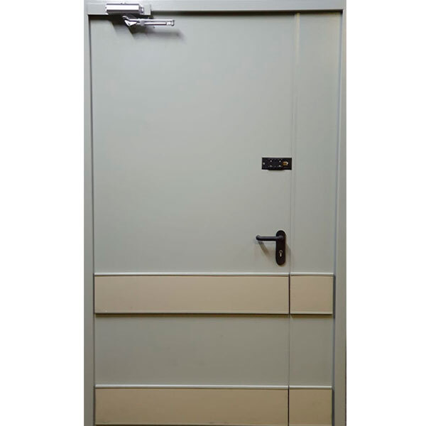Заполнение полотна + короб минплита, уплотнитель Е=D покраска Порошковое напыление RAL. На обе створки двери, через которую производится вывоз товара в торговый зал, установлены две защитные полосы из ПНД (ПВД) толщиной 10 мм и шириной 200 мм. Нижняя кромка первой защитной полосы располагается на отметке 0 дверного полотна, вторая на отметке 600 мм.
